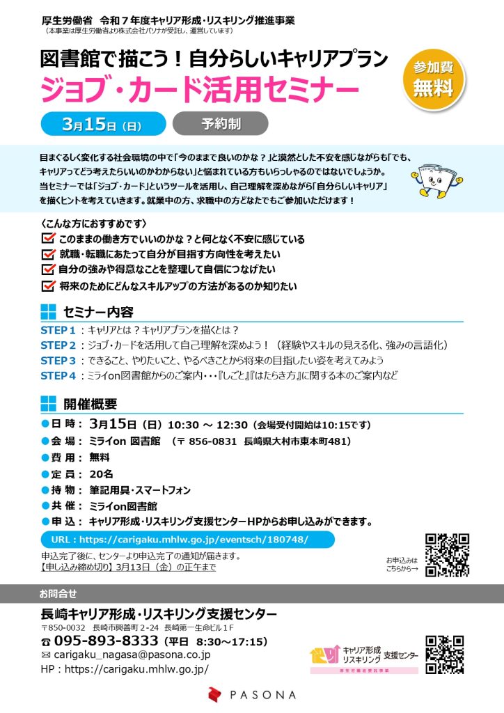 【令和8年3月15日(日)開催】「図書館で描こう!自分らしいキャリアプラン ジョブ・カード活用セミナー」が開催されます