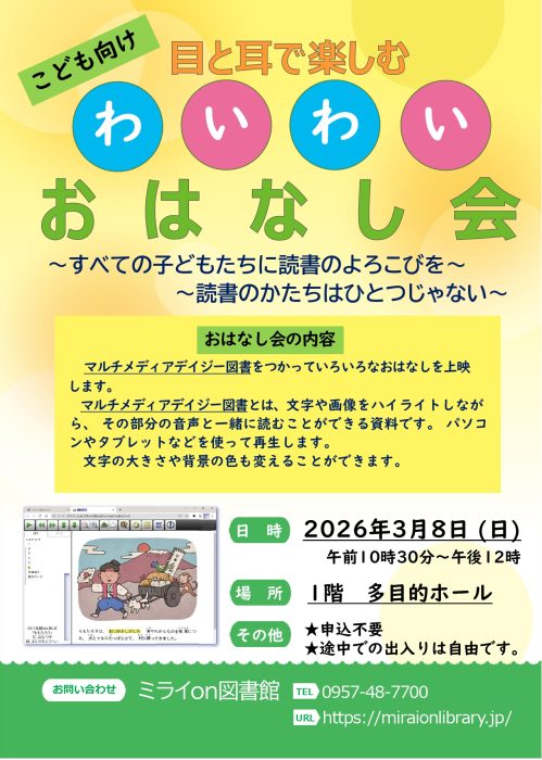 ★マルチメディアデイジー図書を使って、いろいろなおはなしを上映します。マルチメディアデイジーとは、文字や画像をハイライトしながら、その部分の音声と一緒に楽しむことができる図書です。