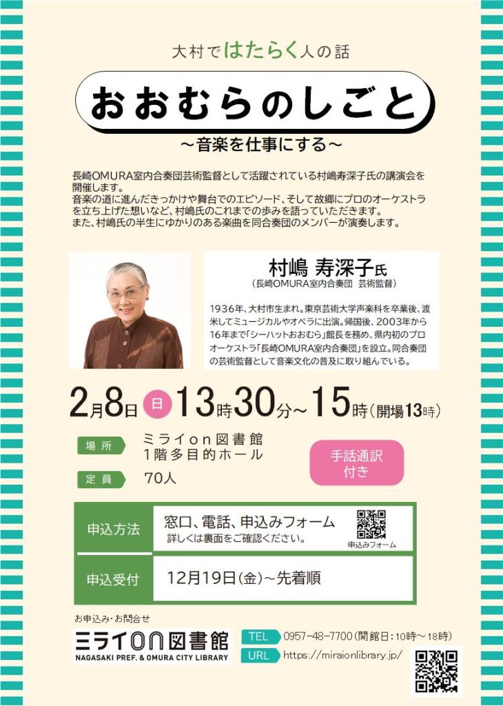 長崎OMURA室内合奏団芸術監督として活躍されている村嶋寿深子氏の講演会を開催します。
