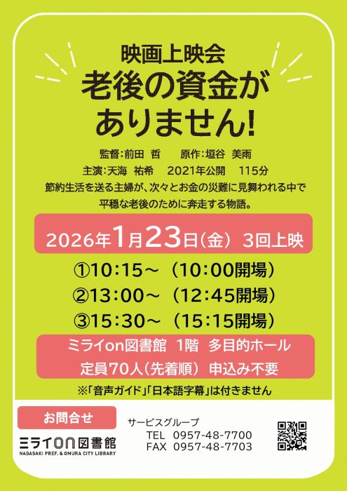 ミライon図書館では、映画「老後の資金がありません!」の上映会を開催します。