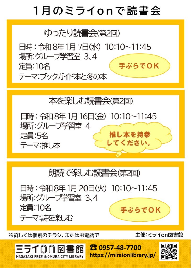 1月に「ミライon読書会」を3回開催します。どの回も、少人数で楽しむ読書会となっておりますので、お気軽にご参加ください。