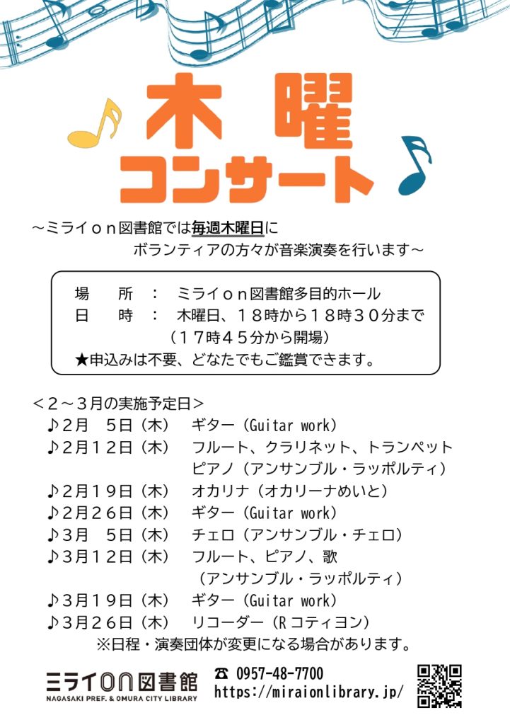 2月~3月の木曜コンサートについて | ミライon図書館